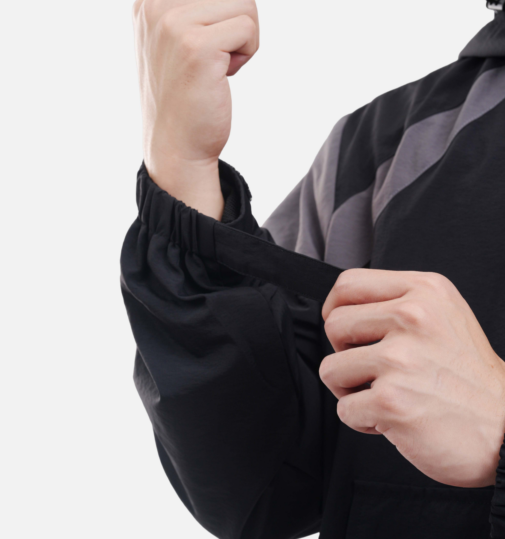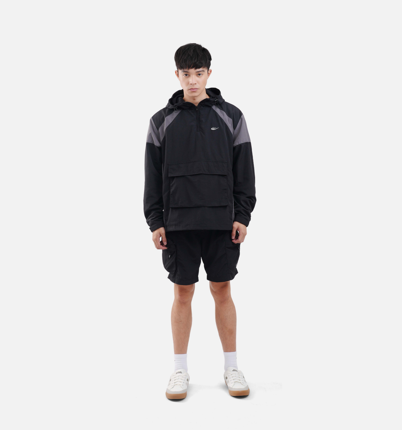 This men’s pullover jacket features a half-zip closure and contrasting color panels on the sleeves and sides.
